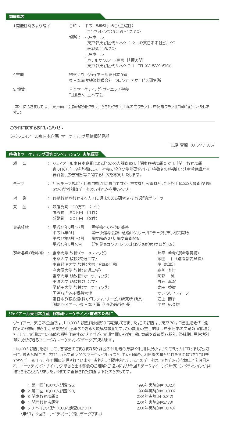 ジェイアール東日本企画(代表取締役社長 小島紀久雄)は、「移動者マーケティング研究コンペティション研究発表コンファレンス」を、来る5月16日(金)JRホール(東京都渋谷区代々木2-2-2 JR東日本本社ビル 2F)にて開催いたします。