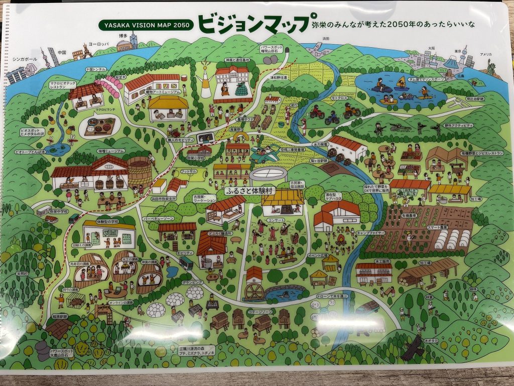 この「ビジョンマップ」は、「ふるさと体験村」を中心に地域の皆さまの「弥栄をこんな地域にしていきたい」、「弥栄にあったらいいな」を表したイラストで、なんと今回の成果報告会では2m幅に大きく印刷されて登場!また、A4サイズのクリアファイルとしても地域の皆さまに配布されることになりました。