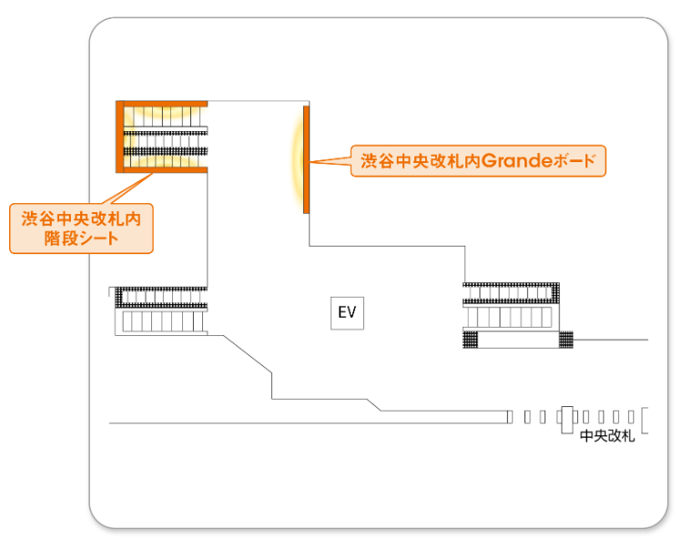 | 渋谷 | 中央改札内 山手線階段壁面 | 階段側:36.00㎡ エスカ側:33.40㎡ オデコ:29.97㎡ | 6,000,000円 | 9,600,000円 | 13,200,000円 | 16,800,000円 |
