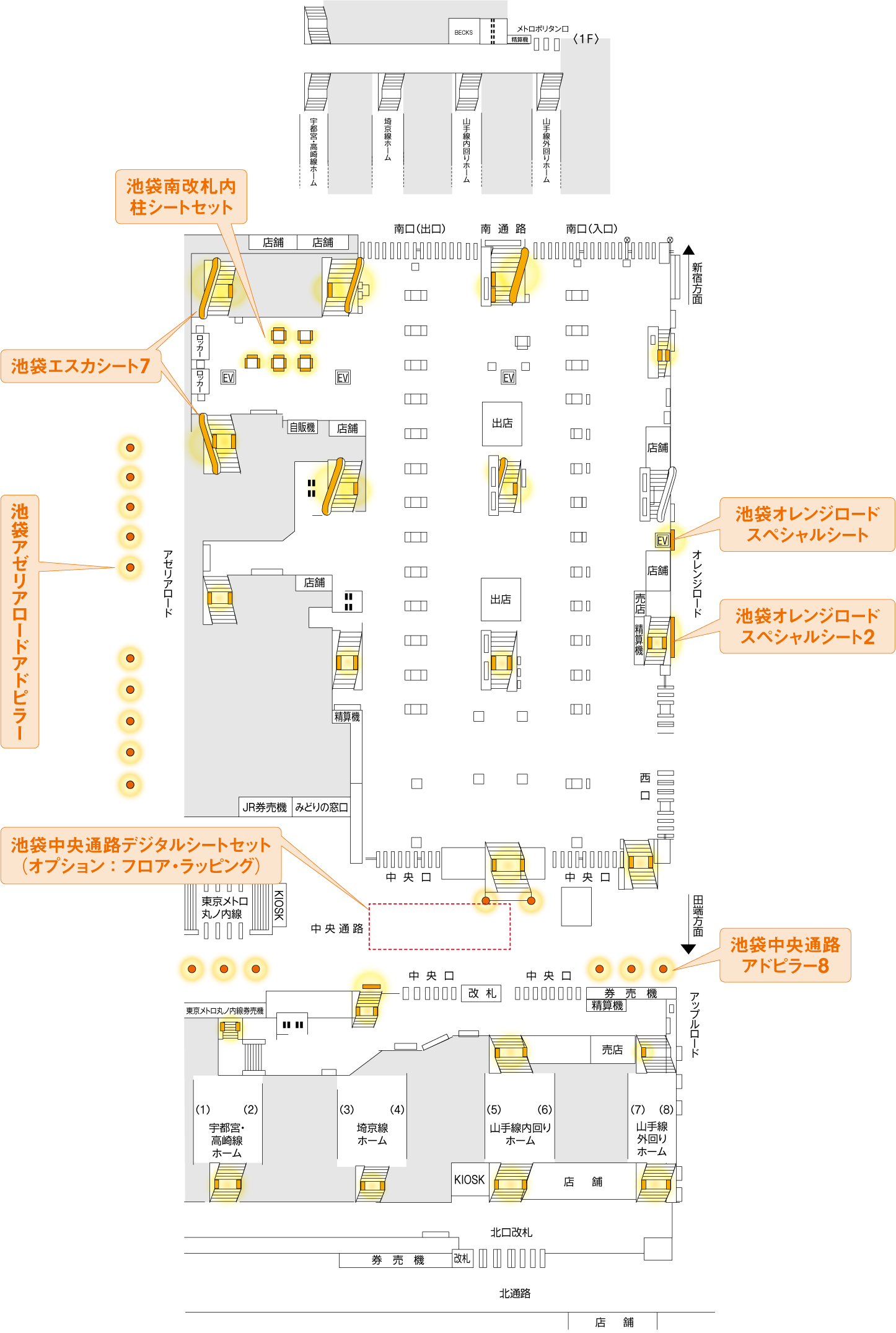 池袋駅の中でも流動が多い中央通路(内3本は丸ノ内線改札口前)にあるため、高い訴求効果が期待されます。