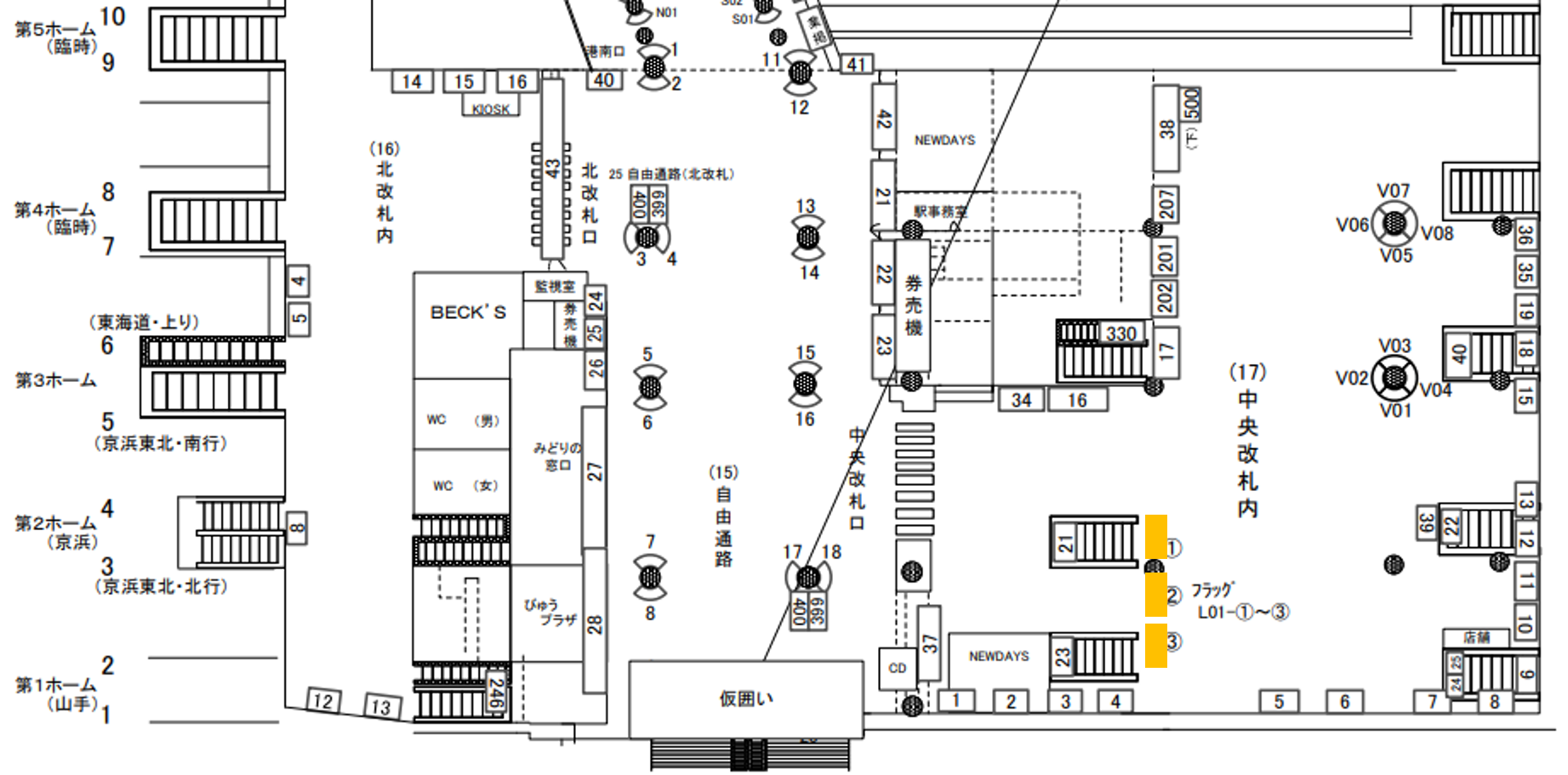 ■品川駅中央改札内に構える圧倒的な訴求力の3基6面のNo.1フラッグ。