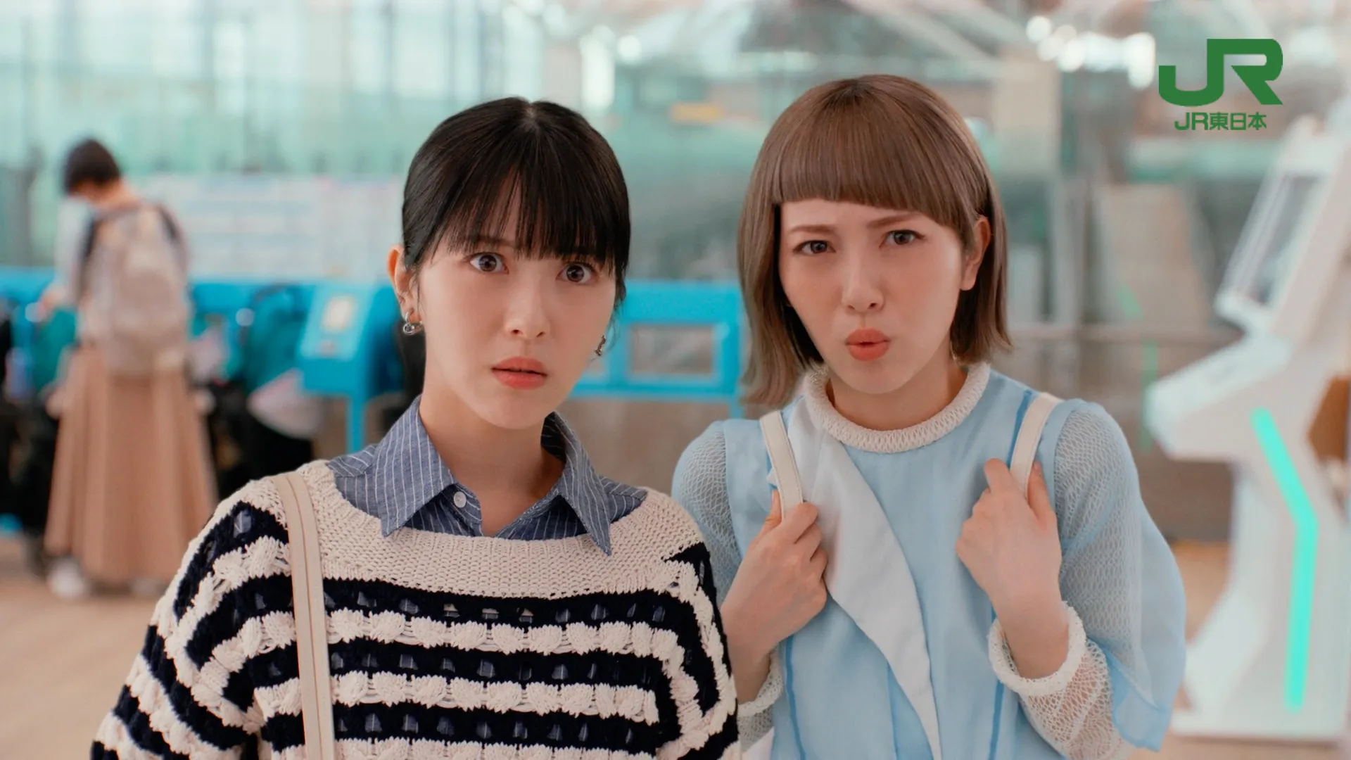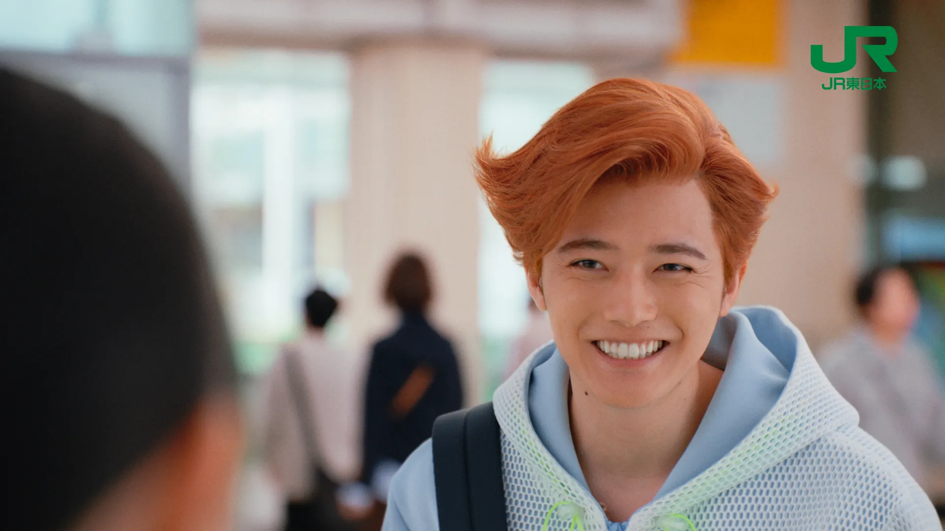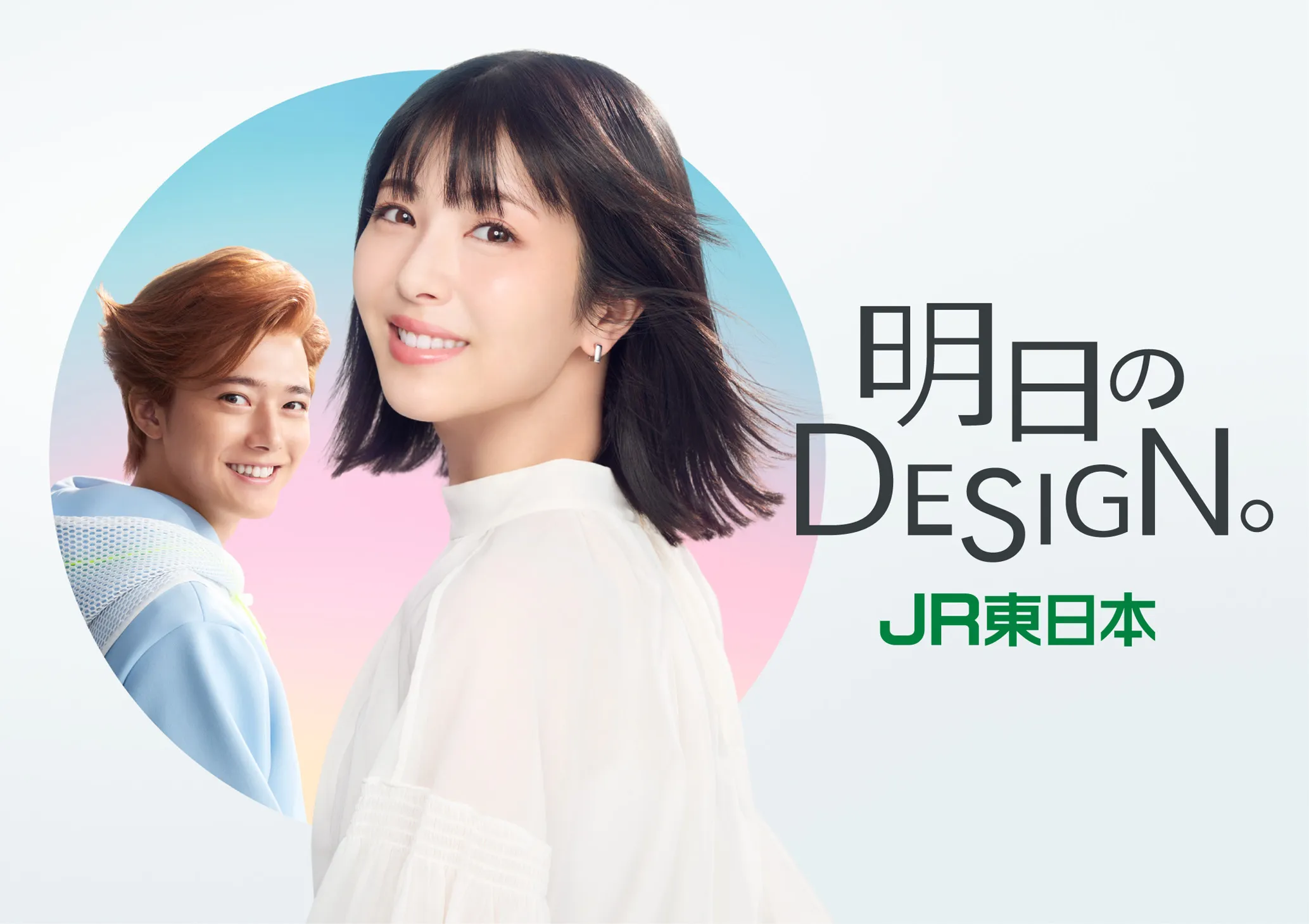 JR東日本の様々な社会課題の解決にチャレンジする取り組みを伝える企業広告シリーズ。「明日のDESIGN。」をキーメッセージに、俳優の浜辺美波さんが「就活中の大学生」と「未来から来た娘」を一人二役で、浜辺美波さんの弟役として「未来から来た息子」を櫻井海音さんが演じています。
