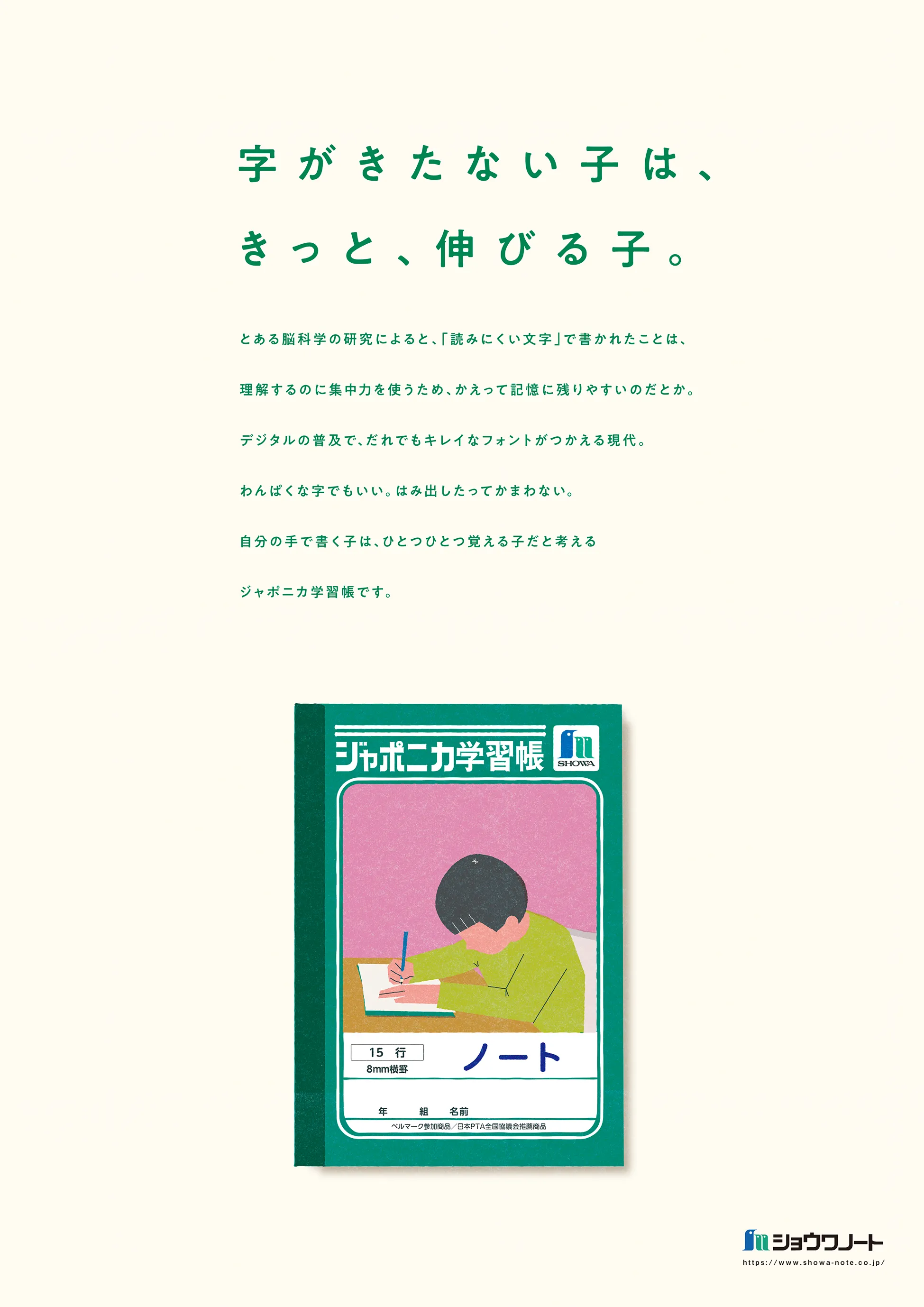 ジャポニカ学習帳への好意形成をテーマにしたグラフィック。子供たちに長年寄り添ってきたブランドならではの、手書きの価値を再認識できるコピーは、TCC新人賞を受賞。