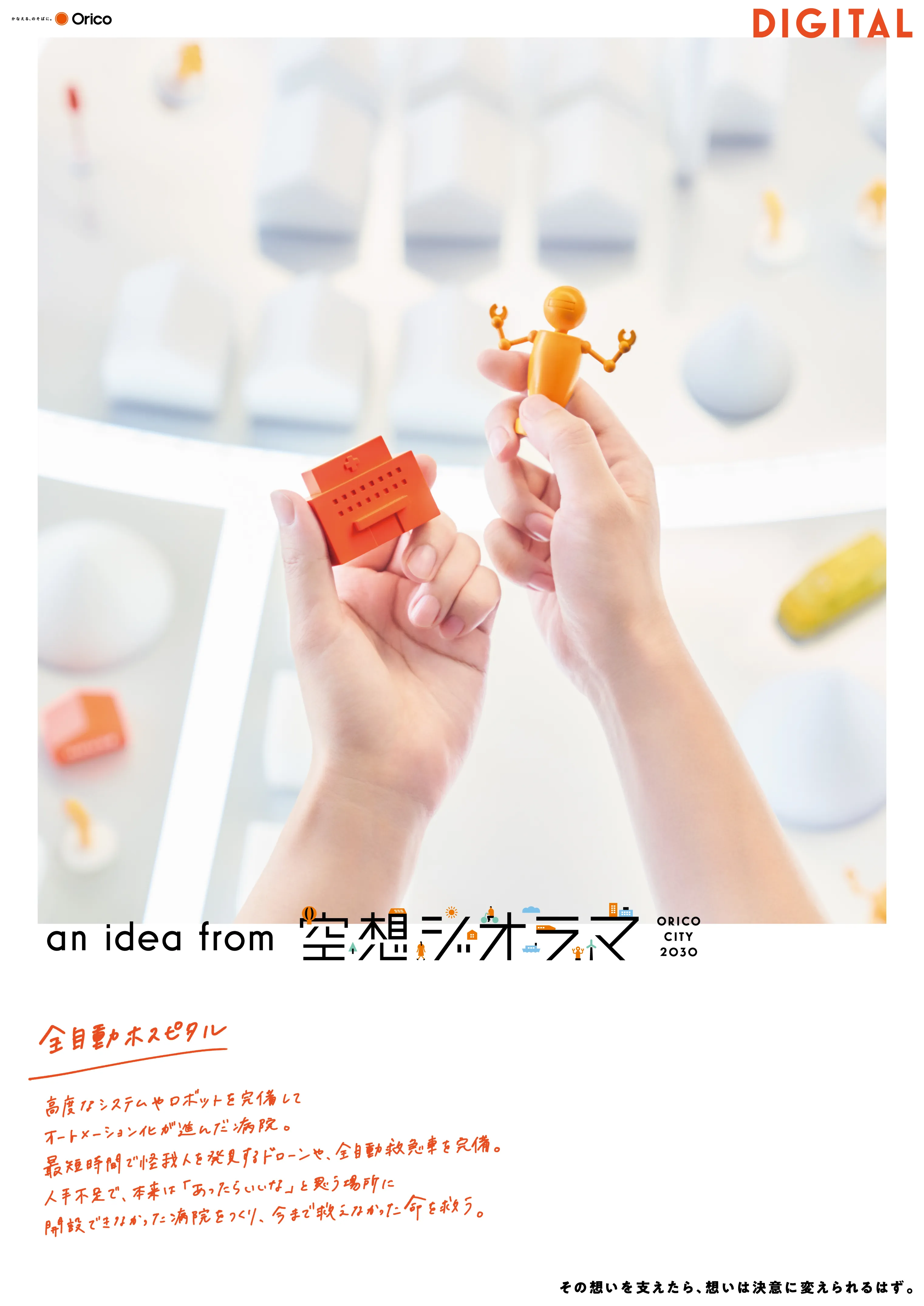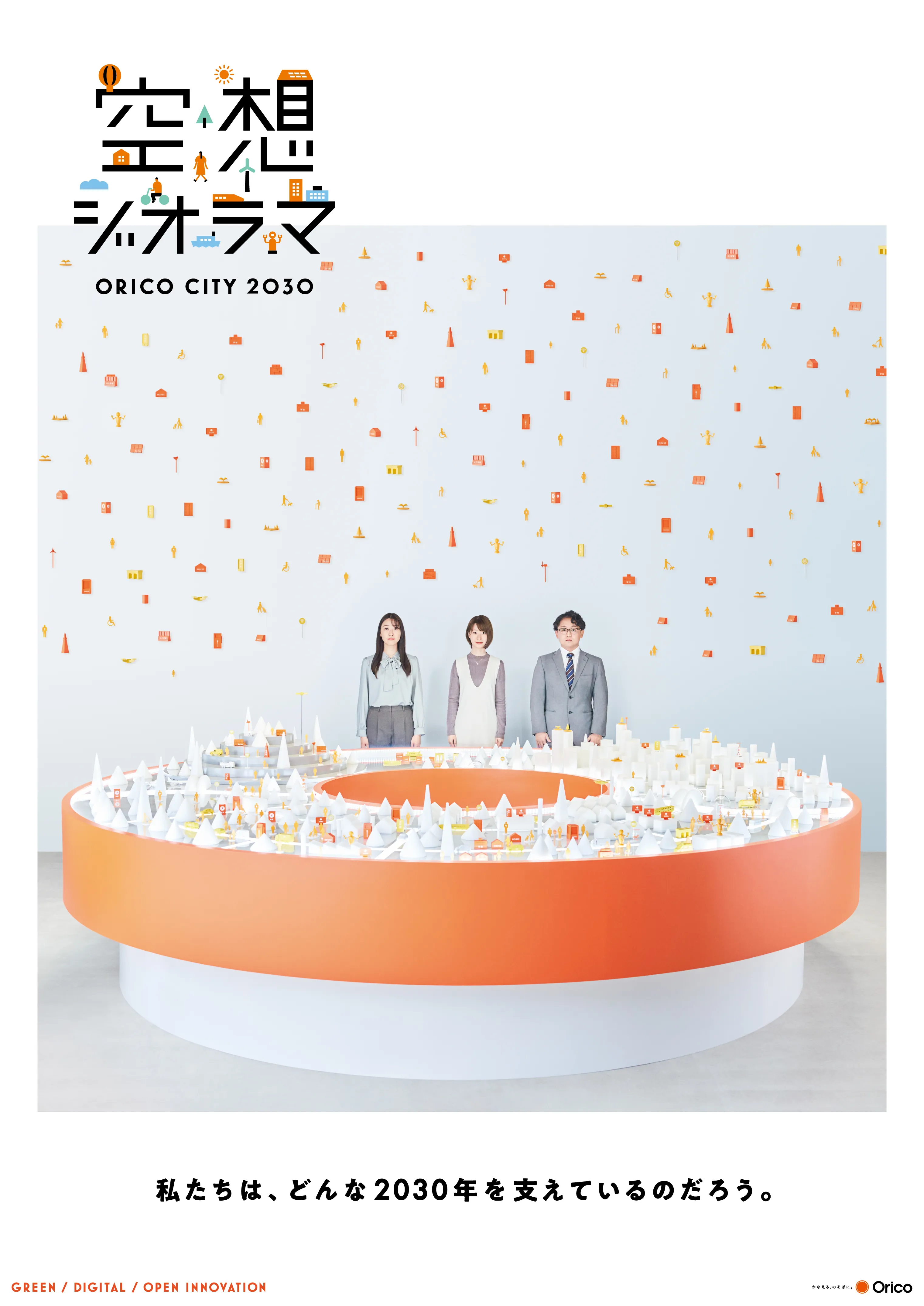 未来の街を想像しジオラマ上に実現していく体験型ワークショップ、空想ジオラマ。「2030年の社会はどのように変わっているのか、その中でオリコが支えることで実現できることは何か」社員の皆様が真剣に話し合う様子をドキュメンタリー調の映像メッセージにし、中期経営計画で掲げる3つのテーマ「GREEN / DIGITAL / OPEN INNOVATION」をステークホルダーに伝える内容と致しました。