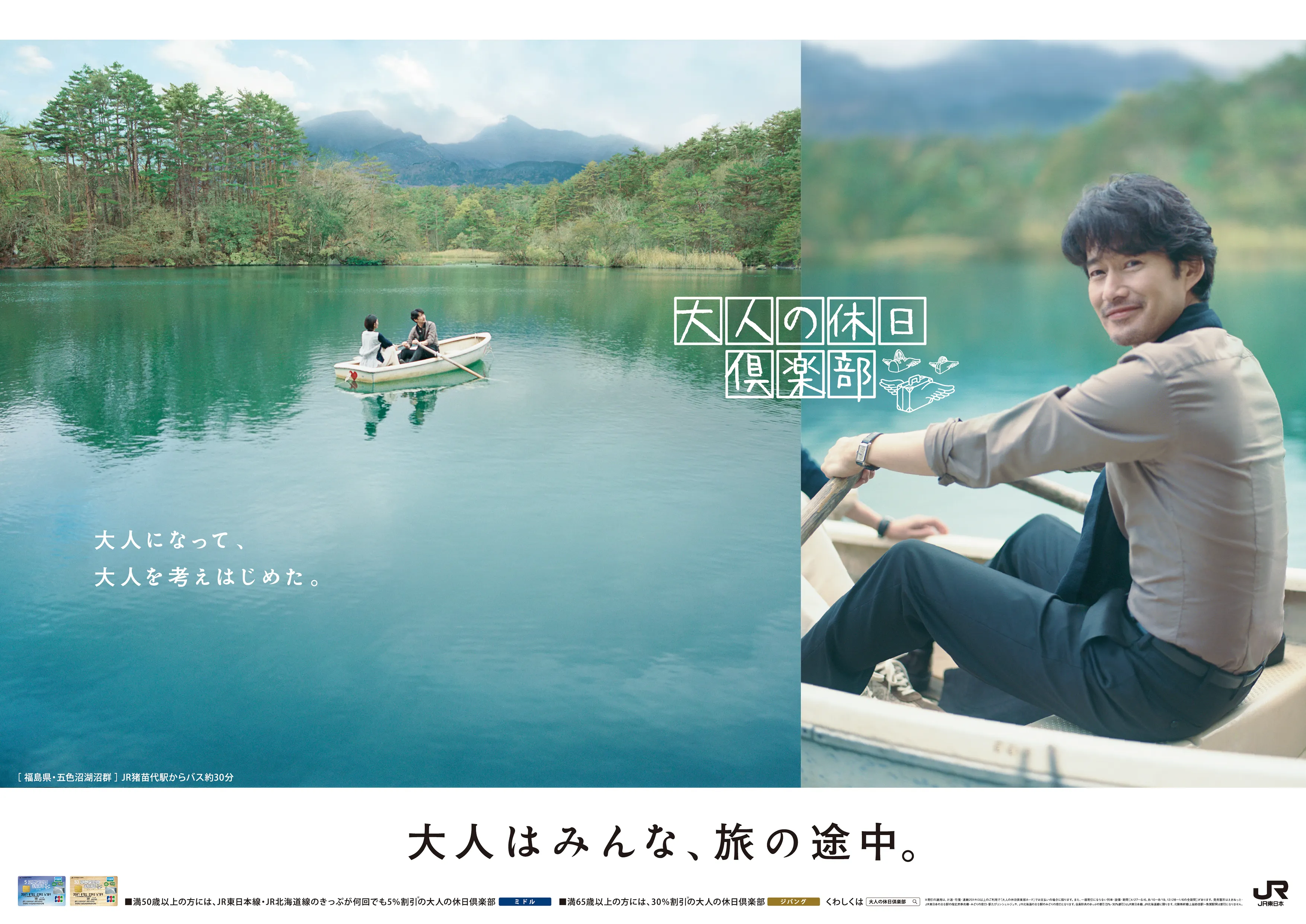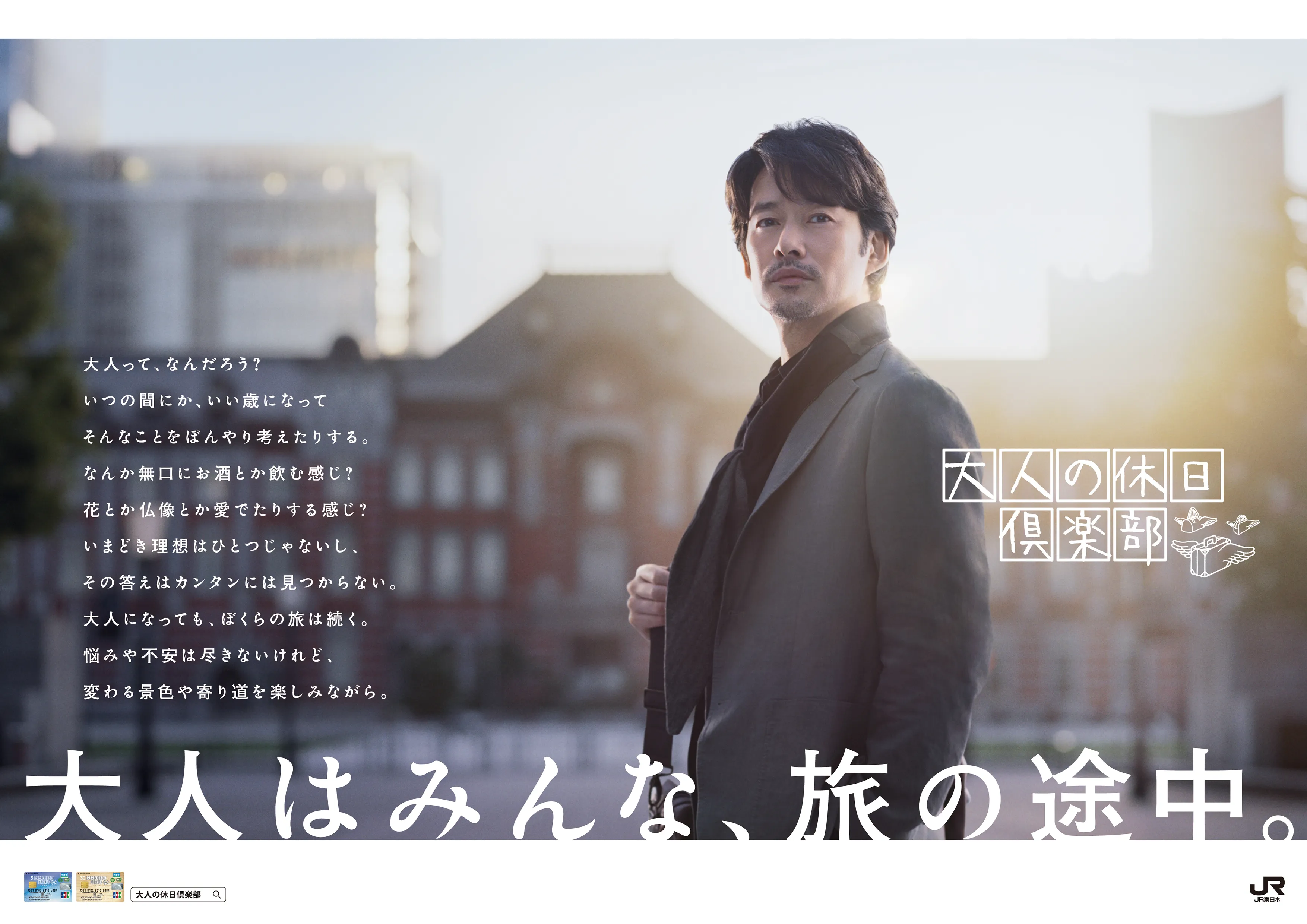 50歳からの旅と暮らしを応援する、JR東日本の会員向けサービス「大人の休日倶楽部」竹野内 豊さんを起用し「大人はみんな、旅の途中。」をキャッチコピーに広告を展開。竹野内さんが演じる主人公が、自分たちの世代らしい「大人になること」の答えを探していく旅のストーリーを描いています。