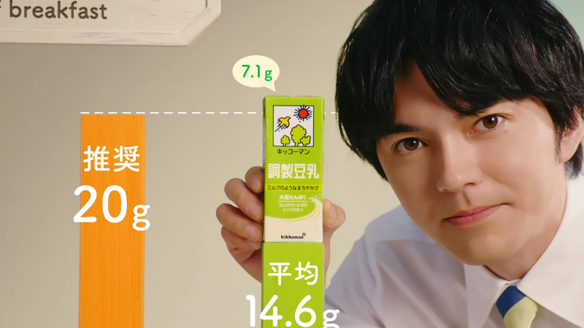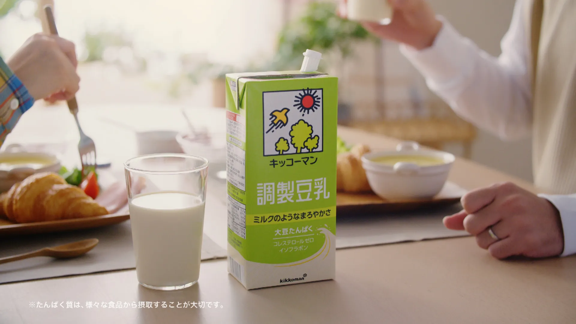 俳優の林遣都さんを起用したキッコーマン豆乳シリーズのCM。朝ごはんをちゃんと食べているつもりでも、実は必要なたんぱく質の量を摂取できていないという問題を指摘。朝ごはんにプラス一杯のキッコーマン豆乳でたんぱく質を補い、“朝の満たんぱく”を提案しています。