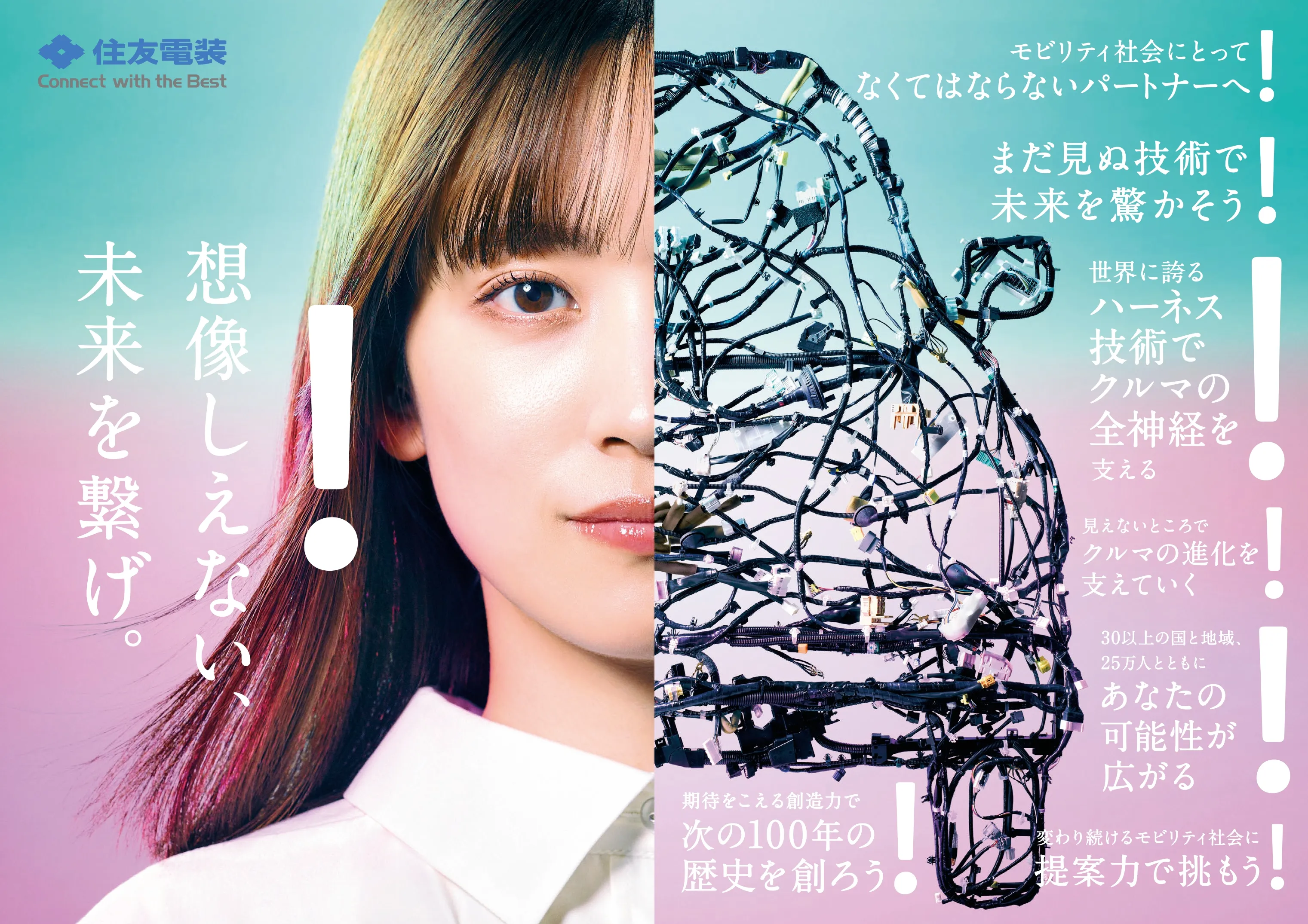 「クルマの血管・神経」に見立てたワイヤーハーネスをアテンションに、学生に向けたメッセージを載せることで企業の魅力や強みを訴求しています。